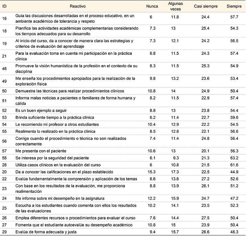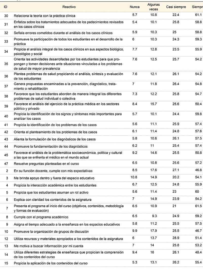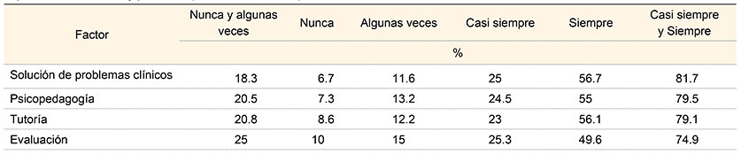 Si bien los resultados de los cuatro factores son similares, la Solución de problemas clínicos es el mejor valorado, seguido de Psicopedagogía; en tercer lugar, se encuentra la Tutoría y, finalmente, Evaluación. Dadas las distribuciones porcentuales obtenidas, no puede hablarse realmente de valoraciones bajas; de hecho, si tomamos de forma conjunta los intervalos Casi siempre y Siempre, todos los reactivos se encuentran arriba del 74.8% de opiniones favorables.