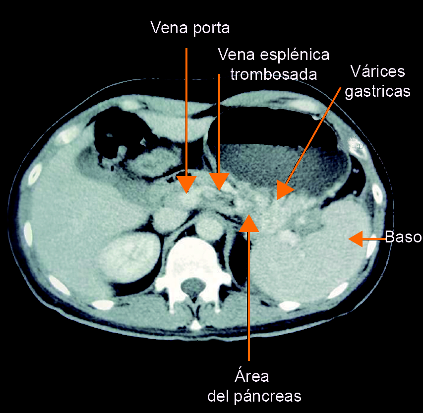 Caso clínico: un hombre de 31 años de edad fue referido a nuestro hospital en 2013 con el diagnóstico de pancreatitis de dos semanas de evolución. Tenía el antecedente de consumo de alcohol. El examen físico no mostró estigmas de cirrosis hepática. El laboratorio reveló hemoglobina de 9.5 g/dL con leucocitos y plaquetas normales. Las pruebas de función hepática fueron normales. La TAC abdominal mostró un pseudoquiste, el cual fue drenado por punción percutánea. Por recurrencia del pseudoquiste, se efectuó drenaje y necrosectomía por laparoscopia retroperitoneal. El paciente presentó hiperglucemia durante su estancia. Después de haber egresado, acudió a urgencias por sangrado gastrointestinal superior sin inestabilidad hemodinámica. La gastroscopia mostró várices gástricas sangrantes. La colonoscopia mostró resultados normales. La biopsia de hígado también resultó normal. La angio-TAC abdominal mostró obstrucción de la vena esplénica. Se sometió a esplenectomía y fue egresado.