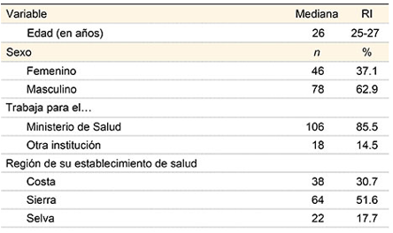 De las 124 encuestas que cumplieron los criterios de selección, el 63% (78) fueron hombres; la mediana de edades fue de 26 años (rango intercuartílico: 25-27 años). Según la entidad que regía su establecimiento de salud, el 85.5% (106) fue en el Ministerio de Salud del Perú (MINSA); la mayoría realizó su SERUMS en la serranía peruana (51.6%); después siguieron aquellos que lo realizaron en la costa (30.7%). El cuadro I nos muestra las características de los médicos y del establecimiento de salud donde laboraban.