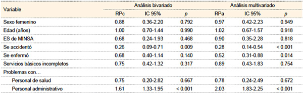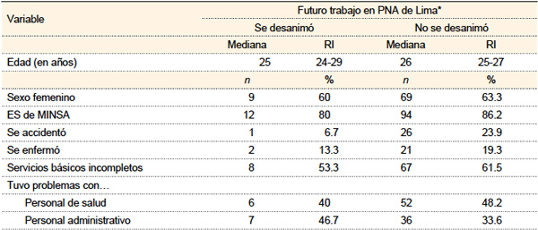 Al realizar el análisis bivariado se halló que el haber tenido un accidente laboral (RPc = 0.26, IC 95% = 0.09-0.71, p < 0.001), y el haber tenido un problema con alguien del personal administrativo durante el SERUMS (RPc = 1.61, IC 95% = 1.33-1.95, p < 0.001) se asociaron con el cambio de la intención de trabajar en el PNA de Lima (cuadro III).
