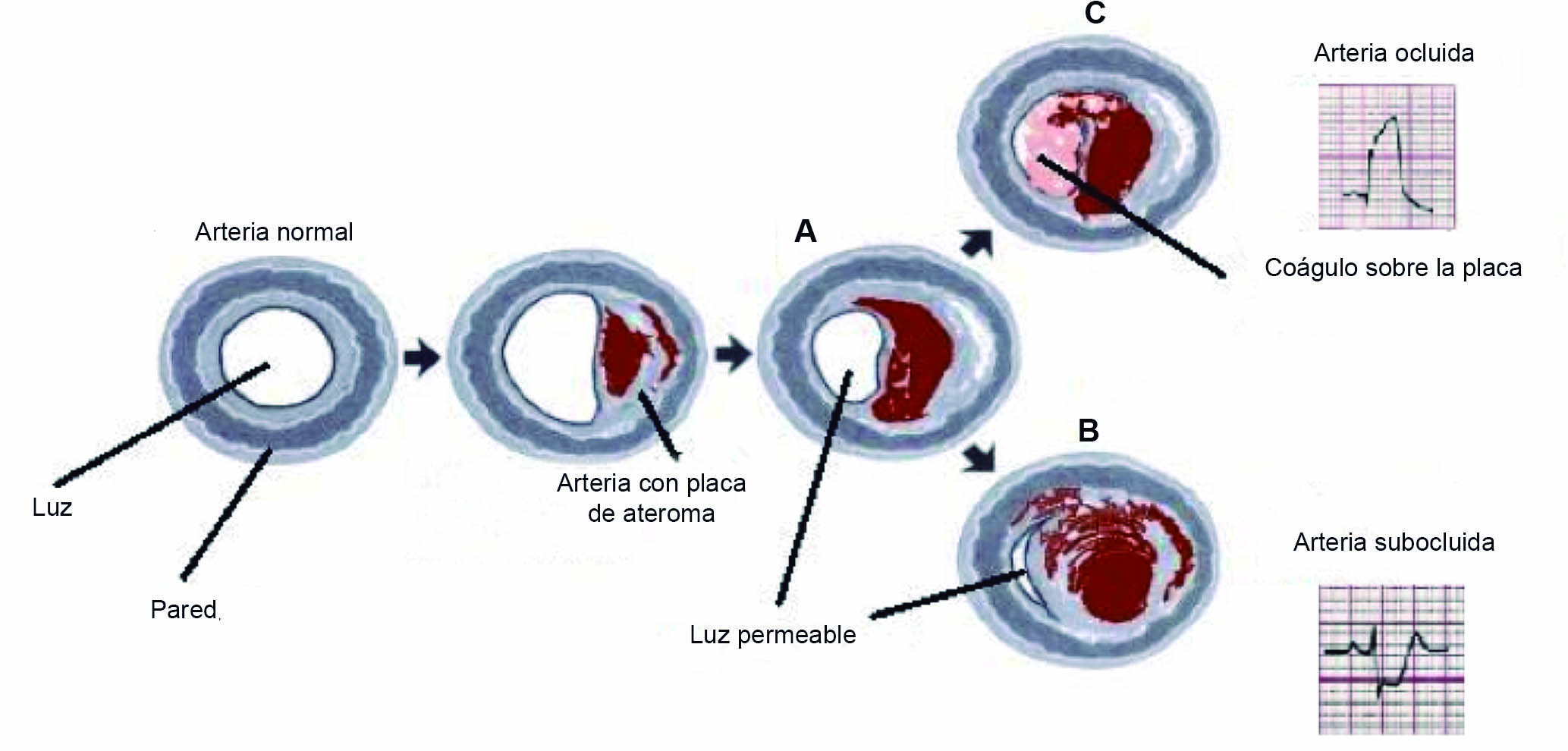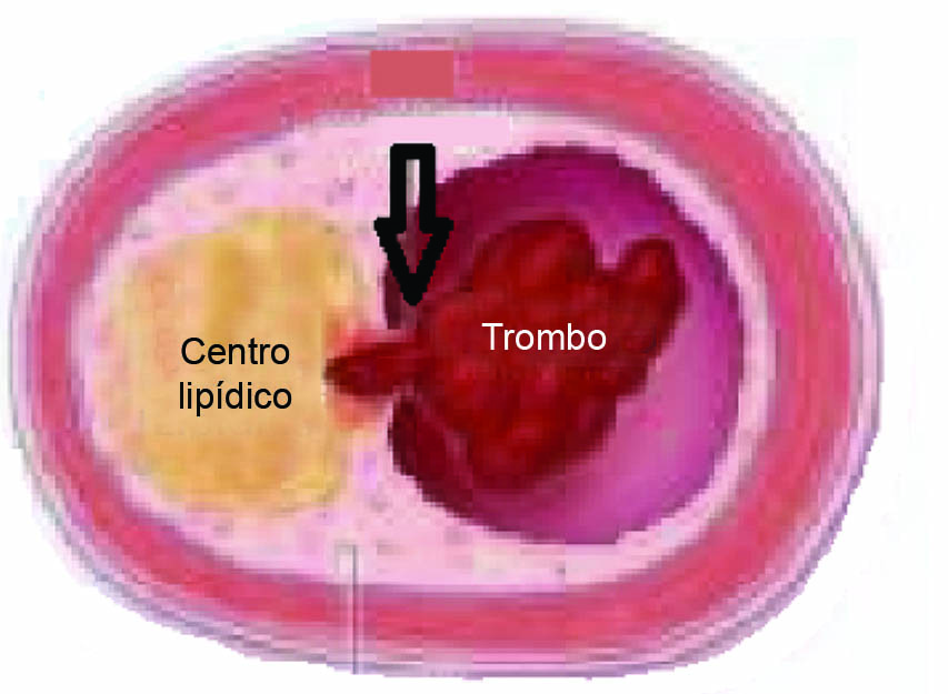 El mecanismo habitual de iniciación para el infarto agudo de miocardio es la ruptura o erosión de una placa coronaria vulnerable, aterosclerótica y cargada de lípidos, lo cual resulta en la exposición de la sangre circulante a materiales del centro lipídico y matriciales altamente trombogénicos en la placa (figura 1).6