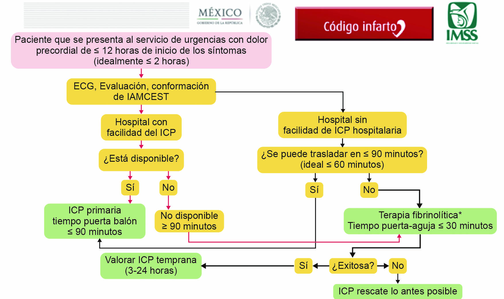 ECG= electrocardiograma; IAMCEST= infarto agudo de miocardio con elevación del segmento ST; ICP= intervención coronaria percutánea; *Si no existe contraindicación