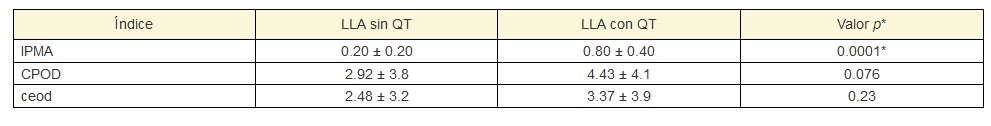 Se realizó una exploración clínica en 103 pacientes, 67 niños y 36 niñas. En el cuadro I se muestran los valores de los índices epidemiológicos de gingivitis y caries: los niños bajo tratamiento de QT presentaron una mayor inflamación gingival (p < 0.01). No se encontraron diferencias significativas en los valores del CPOD, ni ceod, (p > 0.05).