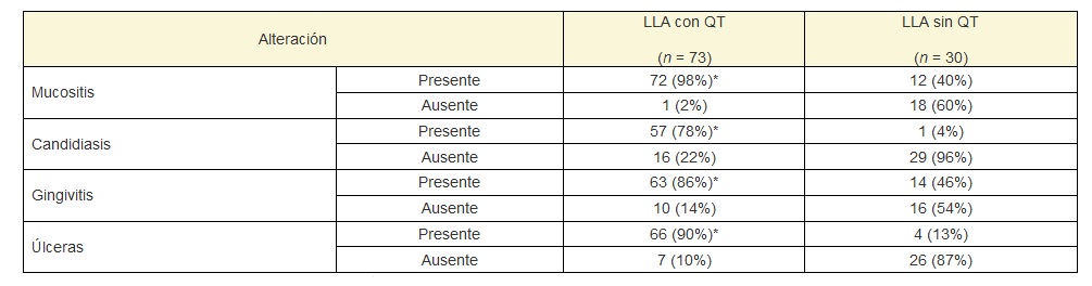 Las manifestaciones bucales de las alteraciones hematológicas como la LLA son frecuentes, y pueden ser manifestaciones primarias de la enfermedad o secundarias a los tratamientos anticancerígenos, entre los que se encuentra la QT. El 78% de los niños que participaron en este estudio presentaron al menos una alteración estomatológica, coincidiendo con Reyes Vivanco et al., quienes informaron que el 80% de los pacientes que reciben QT desarrollaron algún tipo de complicación en la cavidad bucal.3