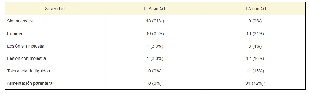 La frecuencia de mucositis fue mayor durante la fase de induccion QT, donde se observó que el 71% de los casos estuvieron en los rangos de mayor severidad con dolor, solo tolerancia a líquidos y necesidad de alimentación parenteral, mientras que en los casos de LLA sin QT la mayor frecuencia estuvo en las categorías de eritema y sin molestia (34%) (cuadro III).