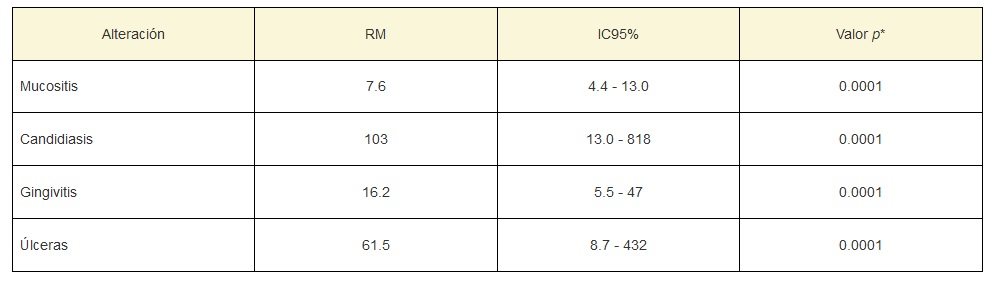 En el cuadro IV se presentan los resultados de la prueba de asociación. Se encontró que la fase de inducción QT fue determinante para la presencia de mucositis: RM = 7.6, IC95%: 4.4-13 y p = 0.0001; candidiasis: RM = 103, IC95%: 13.0-818, p = 0.0001; gingivitis: RM = 16.2, IC95%: 5.5-47, p = 0.0001; así como de úlceras RM = 61.5, IC95%: 8.7-432, p = 0.0001.