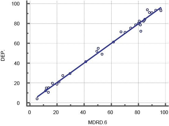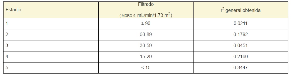 Los resultados de este estudio indican que la correlación y la concordancia, a nivel general, entre el filtrado glomerular primario (MDRD-6) y la DCr es pobre y muy escasa. Aun después de hacer el corte en los resultados buscando de manera intencionada una r2 = 0.990, esta correlación solo se presentó con mayor frecuencia en los estadios de mayor deterioro en la función renal, situación que ha sido estudiada ampliamente y que colocan a la MDRD-6 con una sensibilidad entre un 87 a 97%, mientras que a la DCr la colocan con una sensibilidad entre un 73 a un 89%. En lo referente a la especificidad, la mayor correlación la obtenemos en el estadio 2 y los estudios al respecto de esta situación marcan la MDRD-6 con una especificidad cercana al 90%, mientras que a la DCr la marcan una especificidad menor al 37%. 3 , 8 , 9