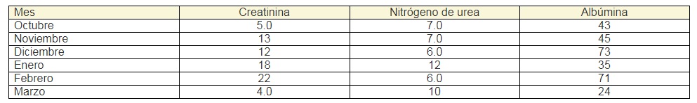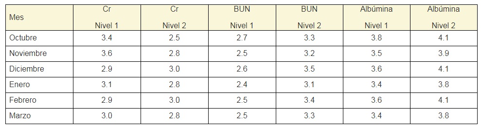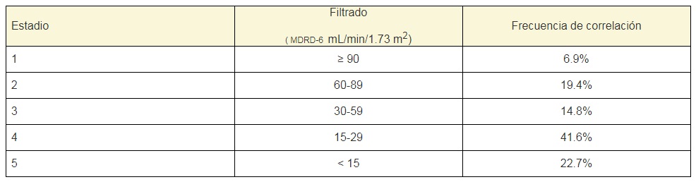 La ecuación utilizada para la determinación del filtrado glomerular primario estimado por la ecuación MDRD-6 (mL/min/1.73 m2 ) fue:2,7,10,13,14,15,16,17