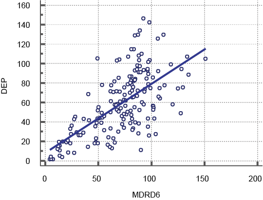 Conclusiones: el filtrado glomerular primario estimado por la ecuación MDRD-6 (mL/min/1.73 m2) y la depuración de creatinina en orina de 24 horas estimada por la ecuación del método convencional (mL/min) guardan una pobre correlación y escasa concordancia.