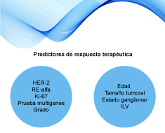 Los médicos que participan en el manejo del cáncer de mama toman en cuenta varias características clínicas y moleculares del tumor, además de las preferencias y comorbilidades de la paciente, para formular recomendaciones terapéuticas, ya que este cáncer se considera de los potencialmente curables. Algunas características clínico-patológicas, incluyendo tamaño tumoral, estado ganglionar e invasión linfovascular son factores de riesgo asociados con el pronóstico, mientras que otros como grado histológico, receptor de estrógeno, receptor de progesterona, receptor del factor de 2 crecimiento epidérmico humano (HER2) y tasa de proliferación se asocian tanto con el pronóstico y la modalidad terapéutica (figura 1).1 El grado histológico bajo, los receptores hormonales-positivos y el HER2-negativo se consideran de buen pronóstico en pacientes tratados con cirugía y terapia endocrina adyuvante, tienen baja sensibilidad a la quimioterapia y no demuestran mucho beneficio. Por el contrario, los tumores de alto grado histológico, con alto índice de proliferación, receptores hormonales-negativos o HER-positivos se asocian con peor pronóstico, sin embargo tienen mayor sensibilidad a la quimioterapia, la cual se demuestra por un alta tasa de respuesta patológica completa con tratamiento neoadyuvante, y mayor beneficio con tratamiento adyuvante en comparación con los tumores de bajo grado.