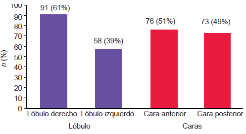 De los 149 nódulos encontrados, 51.14% estaban en la cara anterior mientras que 48.86% en la cara posterior. Este dato es relevante por el hecho de que un nódulo menor a 5 mm es muy difícil de diagnosticar por medio de exploración física,26 y cuando este se encuentra en la cara posterior es prácticamente inaccesible para ser diagnosticado por este método, por lo que cualquier medida de diagnóstico realizada de forma temprana debe incluir estudios con sensibilidad y especificidad aceptables para los nódulos localizados en la cara posterior de la glándula.