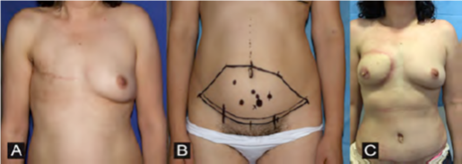 El uso de colgajos libres varía dependiendo del sitio a reconstruir. En reconstrucción mamaria, por ejemplo, el uso de colgajos libres nos permite disponer de un considerable volumen de tejido, con poca morbilidad en el sitio donador y mejor irrigados en comparación con colgajos pediculados (figura 1), lo cual se traduce en una mayor libertad en el moldeamiento de la mama y una mejoría considerable en la simetría.1 De manera general, recurrimos a los colgajos libres cuando nos enfrentamos a defectos complejos o extensos, que son difíciles o casi imposibles de reconstruir de manera adecuada con colgajos locales o pediculados (figura 2). Este tipo de colgajos deben ser considerados en una etapa precoz del algoritmo de reconstrucción de cualquier área si se puede anticipar un mejor resultado final.