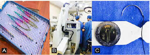 El instrumental básico que usamos para realizar estos procedimientos consiste en 2 sets, cada uno de los cuales tiene pinzas de joyero rectas y anguladas, pinza de joyero con dientes, microtijeras recta y curva, portaagujas castroviejo recto y curvo, pinza dilatadora, pinza aplicadora de clamps, microclamps dobles y pinza bipolar de joyero. Adicional a esto, para los procedimientos de supermicrocirgía usamos un set especial consistente en portaagujas castroviejo con punta de 0.1 mm y pinzas de joyero de 0.05 mm. Preferimos el instrumental de titanio ya que es significativamente más liviano que el instrumental convencional (figura 3 A).
