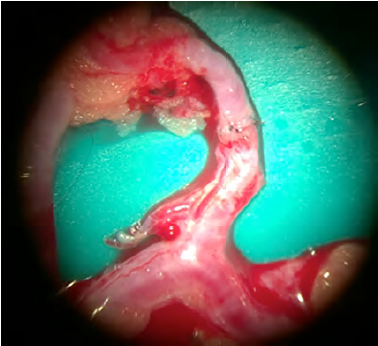 Prácticamente, la totalidad de las anastomosis que realizamos en nuestro hospital (ya sean término-terminal o término-lateral) son con técnica de sutura continua (figura 4). En nuestra experiencia, la consideramos una técnica que se realiza en menor tiempo y que ahorra más material de sutura en comparación con la técnica de puntos interrumpidos (una sola sutura nos alcanza, en promedio, tanto para la anastomosis venosa como la arterial).