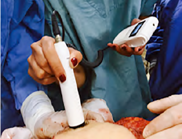 En nuestro centro realizamos la vigilancia de los colgajos microvasculares cada hora las primeras 24 horas del posoperatorio, cada 2 horas, las segundas 24 horas y cada 3 horas a partir del tercer día y hasta el alta del paciente. Los métodos que usamos para dicha vigilancia, son el método clínico y mediante el uso de un dispositivo Doppler portátil (figura 5). Actualmente estamos llevando a cabo un estudio de prueba diagnóstica para valorar la utilidad de una microcámara termográfica infrarroja para la vigilancia de estos colgajos.