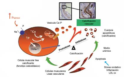 Las células implicadas en la CV son las CMLV, las cuales expresan Cbfa-1 (Core binding factor alpha 1) y BMP-2 (bone matriz protein 2), esenciales para la diferenciación ósea, que al ser expuestas a fósforo (P) y/o calcio (Ca), presentarán un aumento en su expresión y, por tanto, mayor será la cantidad de las proteínas procalcificantes, produciendo el desarrollo de núcleos de cristales de hidroxiapatita en la matriz extracelular, y al igual que como ocurre en los huesos, el efecto conjunto del fósforo y calcio aumenta la calcificación.