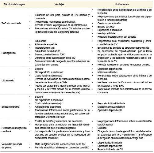 Los métodos diagnósticos recomendados para la CV son variados y de complejidad diferente, cada uno de ellos aporta información distinta y algunos solo son útiles en la búsqueda intencionada en determinadas localizaciones anatómicas (por ejemplo, la calcificación de la íntima media de la carótida). El estándar de oro para CV es la tomografía axial computarizada (TAC), sin embargo debido al alto costo y el acceso limitado en algunos lugares, es necesario considerar estudios diagnósticos alternativos como son las radiografías simples.10 Las ventajas y limitaciones de cada uno de los métodos diagnósticos se presentan en el cuadro I.15