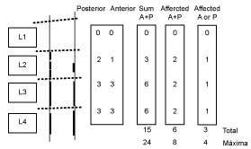 El puntaje de Kauppila, denominado Escala de severidad anterior y posterior, (figura 2), evalúa las calcificaciones presentes en la aorta abdominal a nivel de las vértebras lumbares L1-L4 mediante una radiografía lateral simple de columna lumbar. Toma en cuenta los espacios intervertebrales para dividir la aorta abdominal en 4 secciones y, a su vez, la longitud equivalente a cada vertebra se divide en 2 caras: anterior y posterior; se otorga un punto a la presencia de calcificación de hasta 1/3 del cuerpo vertebral, 2 puntos si la CV es hasta 2/3 y 3 puntos si está calcificada en toda la extensión de su cuerpo vertebral correspondiente; esto para cada pared, por lo que 4 cuerpos vertebrales de 2 caras (anterior y posterior) traen como resultado máximo posible 24 puntos, (12 de cada cara).16 Esta escala ha demostrado ser pronóstico de muerte y guarda una adecuada asociación con el CAC.18