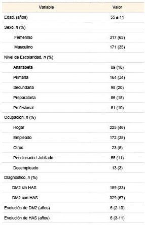 Se estudiaron 488 pacientes con DM2, con edad promedio de 55 ± 11 años, 65% fueron mujeres, más de la mitad tenían un nivel de escolaridad de primaria o menor (n = 253) y el 46% realizaba actividades del hogar. El tiempo mediana de evolución de la DM2 fue 6 (2-10) años y el tiempo mediana de evolución de la HAS fue de 6 (3-11) años; la HAS estuvo presente en 67% de los pacientes (cuadro I).