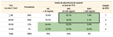 El área sombreada indica individuos con ERC; dentro de las líneas gruesas se encuentran individuos con nefropatía temprana, mientras que fuera de ellas pero dentro del área sombreada se encuentran los sujetos con nefropatía establecida