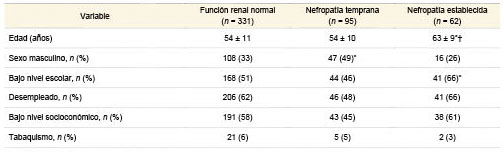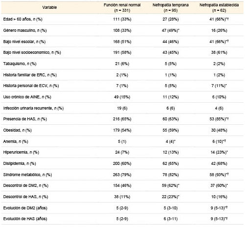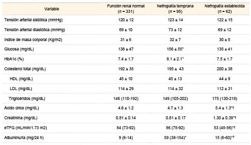 *p < 0.05 vs. función renal normal †p < 0.05 vs. nefropatía temprana.El descontrol metabólico fue peor en ambos grupos con nefropatía que en aquellos con función renal normal, mientras que la frecuencia del sexo masculino y el descontrol hipertensivo fueron mayores en el que grupo de NT que en el de función normal. Finalmente, la historia personal de ECV y la hiperuricemia fueron más frecuentes en los pacientes con NE que en los de función renal normal.