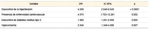 En el análisis multivariado (cuadro VI), los únicos factores que predijeron de manera independiente y significativa la presencia de nefropatía fueron el descontrol de la hipertensión, la presencia de ECV, el descontrol de la DM2 y la hiperuricemia.