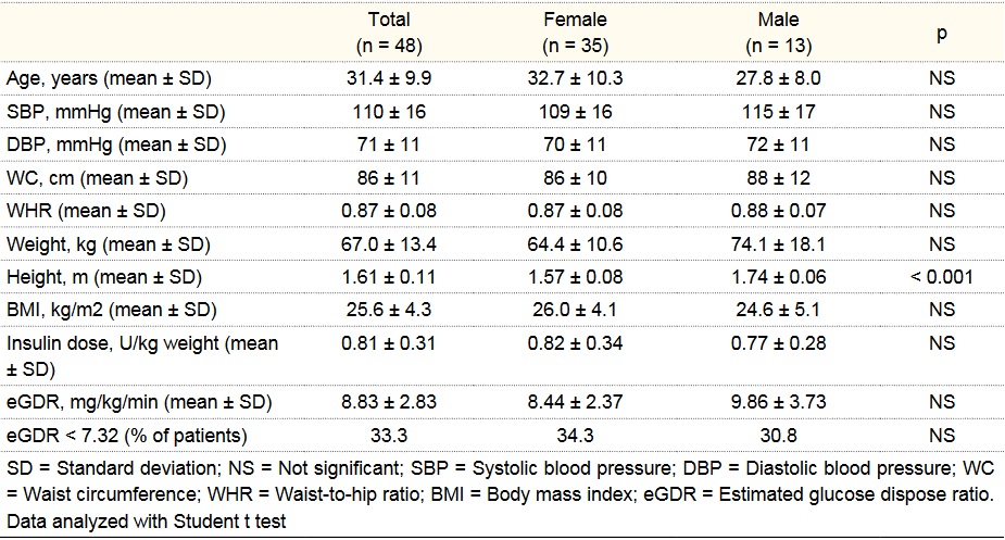 Forty-eight patients fulfilled the inclusion criteria (three patients were discharged due to a detectable C-peptide and family history of diabetes compatible with Maturity Onset Diabetes of the Young, MODY); 73% of them were female. Mean age was 31 ± 10 years and mean age at diagnosis was 12.5 ± 6.6 years. At least 71% of them had family history of type 2 diabetes, 65% had a family member with hypertension, 56% with obesity, 40% dyslipidemia and 29% reported first degree family members with cardiovascular disease. Regarding personal comorbidities 35% of patients had dyslipidemia, 17% hypertension, 19% chronic kidney failure (no more than KDOQI stage 2) and 35% hypothyroidism. Additionally, less than 4% had other autoimmune comorbidities (mainly rheumatoid arthritis and vitiligo). None of these patients had any evidence of cardiovascular diseases. Regard to treatment, 50% of patients had intensive treatment (1 or 2 basal insulin doses with 3 rapid insulin bolus), 35% were on conventional treatment (1 or 2 basal insulin doses with 1 or 2 rapid insulin bolus) and 10% were using insulin pump. Table 1 describes basal characteristics of the total group. There were no differences by gender except in height, however weight and BMI were similar.