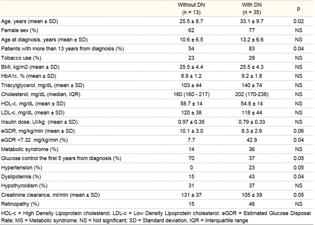 Twenty-nine percent of our patients met MS criteria according to the Joint Statement Criteria.9 Despite that there were no differences in frequency of MS between patients with or without DN, we observed that 43% of patients with DN had eGDR lower than 7.32 mg/kg/min, cut-off point used for diagnostic insulin resistance in our population (table 2). We also observed borderline significance in the percentage of hypertension and dyslipidemia among groups. None of the other metabolic or clinical parameters were different between groups.
