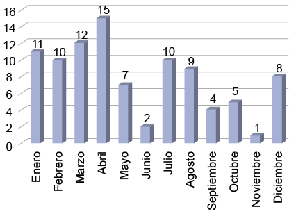 Se revisaron los expedientes clínicos de 94 pacientes, 57 hombres (61%) y 37 mujeres (39%). La media de la edad fue de 53 años (rango 21-82 años). El 50% de los casos se presentaron en los primeros 4 meses del año, siendo abril el mes con más frecuencia con 16% (figura 1). Con antecedente de diabetes mellitus 2 se encontraron 22 pacientes (23%), hipertensión arterial 30 (32%), tabaquismo 35 (37%). Previo al inicio de los síntomas del SGB, 39 pacientes (41%) presentaron infección gastrointestinal, 29 (31%) infección de vías respiratorias, 3 (3%) infección gastrointestinal y de vías respiratorias, 7 (7%) otras infecciones, 1 paciente se vacunó contra la influenza, 1 paciente fue sometido a cirugía y 14 pacientes (15%) no presentaron un cuadro patológico previo (cuadro I). La media de días del cuadro previo a la instalación del SGB fue de 10.9 ±7.