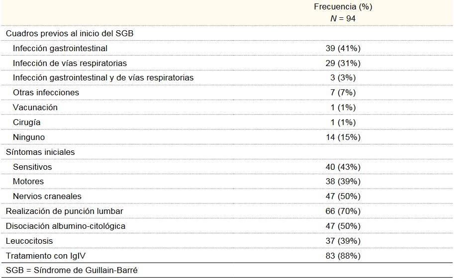 Con respecto a la presentación clínica, los síntomas iniciales fueron sensitivos en 40 pacientes (43%) y motores en 38 (39%). En 47 pacientes (50%) se documentó afección de nervios craneales, siendo los más frecuentemente afectados: el facial (30%), los oculomotores (28%) y bulbares (16%), 31 pacientes (33%) presentaron disautonomías.
