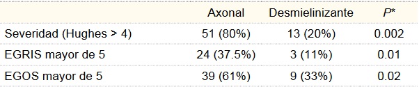 Conclusiones: se documentan en esta muestra características demográficas y clínicas similares a lo reportado en la literatura, así como la mayor proporción de variedades axonales, las cuales tienen mayor severidad en la presentación clínica así como mal pronóstico.