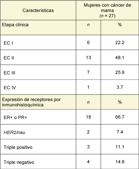 La etapa clínica más frecuente en el grupo CaM fue la EC II con 48.1% y la menos frecuente la EC IV con 3.7% (p < 0.05). Respecto a la expresión de receptores, los que se expresaron en una mayor proporción fueron los receptores hormonales (66.7%, p < 0.05) de acuerdo con los resultados de inmunohistoquímica (cuadro I).