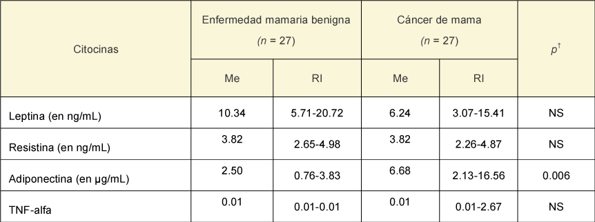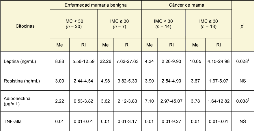 Métodos: estudio transversal analítico. Se determinaron los niveles séricos de leptina, adiponectina, resistina y TNF-alfa, así como el índice de masa corporal (IMC) de 27 mujeres con CaM incidente y 27 con EMB. Se utilizaron promedios, desviaciones estándar, medianas (Me) y rangos intercuartílicos, así como las pruebas t de Student, U de Mann-Whitney y Kruskall-Wallis para identificar diferencias entre los grupos.