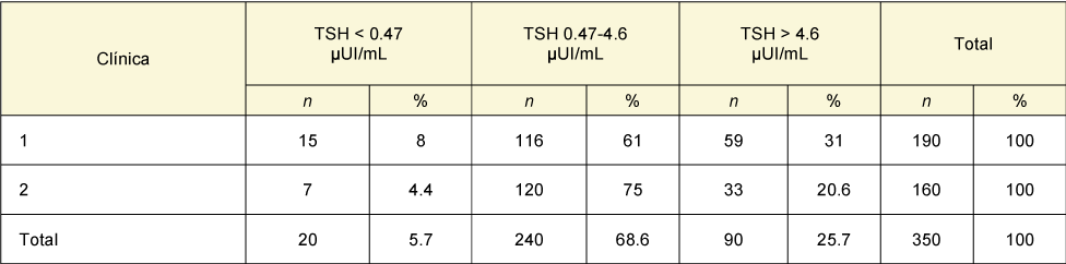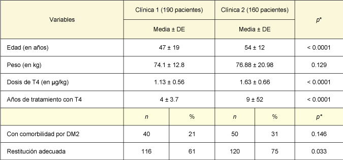 Un total de 350 pacientes fueron evaluados. De la clínica 1 se obtuvieron 190 pacientes y de la clínica 2 se evaluaron 160. La media de edad fue de 47 ± 19 y 54 ± 12 años, respectivamente (p < 0.0001). Asimismo, la dosis de levotiroxina en µg/kg fue de 1.13 ± 0.56 en la clínica 1 y 1.63 ± 0.66 en la clínica 2 (p < 0.0001). El peso se midió en kilogramos y la media de la clínica 1 resultó en 74.1 ± 12.8 y la de la clínica 2 en 76.88 ± 20.98 (p = 0.129). En la clínica 2, el tiempo de tratamiento promedio fue de 9 ± 5.2 años y en la clínica 1 de 4 ± 3.7 años (p < 0.0001). La comorbilidad más frecuentemente asociada fue la diabetes mellitus tipo 2 (DM2). En la clínica 1 hubo 40 casos (21%), mientras que en la clínica 2 había 50 pacientes diabéticos (31%) (p = 0.146).