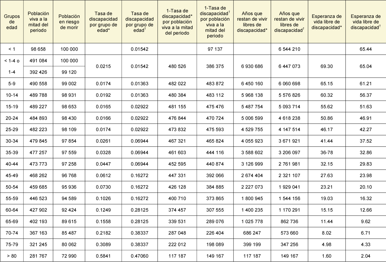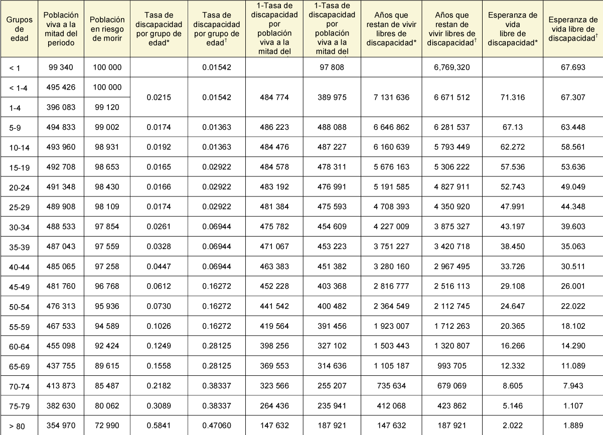 Años que restan de vivir libres de discapacidad: se obtiene sumando de abajo para arriba los datos de la columna 1 – tasa de discapacidad por población viva a la mitad del periodo, correspondientes a cada grupo de edad
