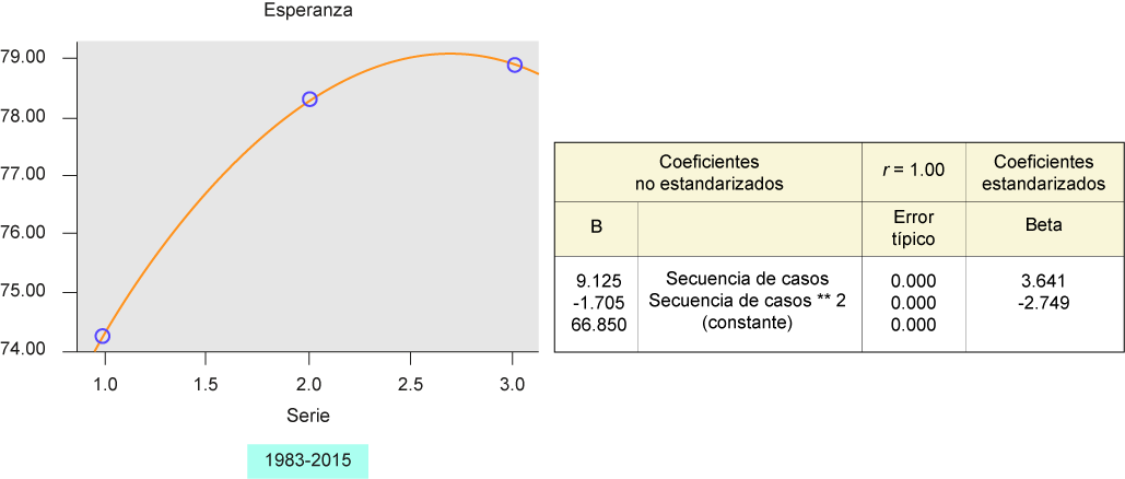Los datos de la esperanza de vida se procesaron con el programa SPSS, para obtener un modelo gráfico de regresión, con ajuste del cuadrático curvilíneo.