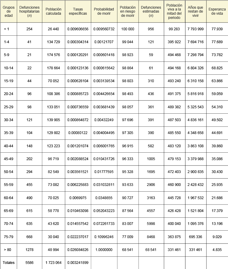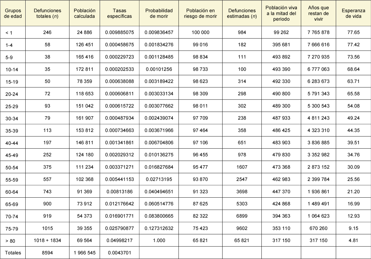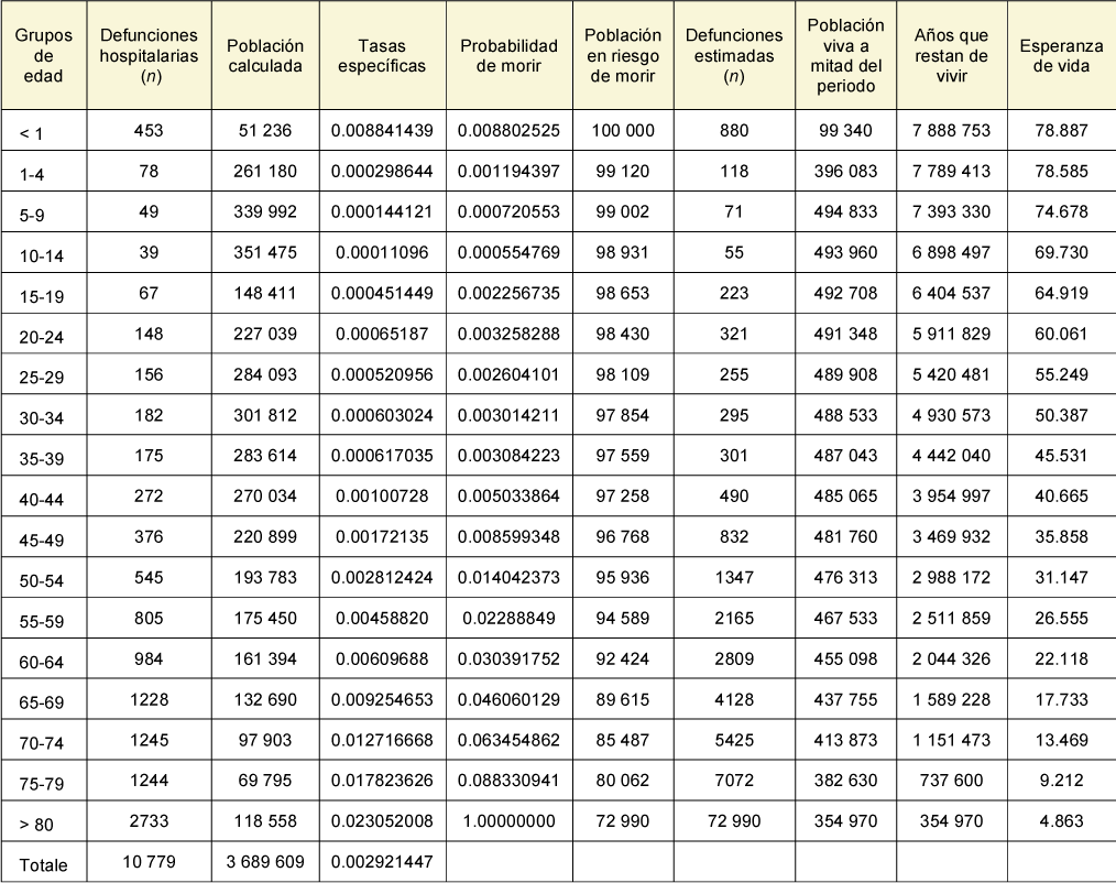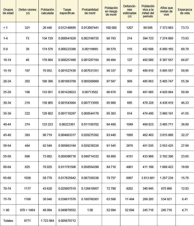 Para el cálculo de la tabla de vida al nacer, se utilizó el método abreviado de Lowell J. Reed y Margaret Merrell3 (desarrollado en 1939), con el cual no se hacen los cálculos año por año, sino que se calcula por grupos quinquenales de edad, con excepción del primer grupo de menores de un año y el último grupo de personas con 80 o más años.