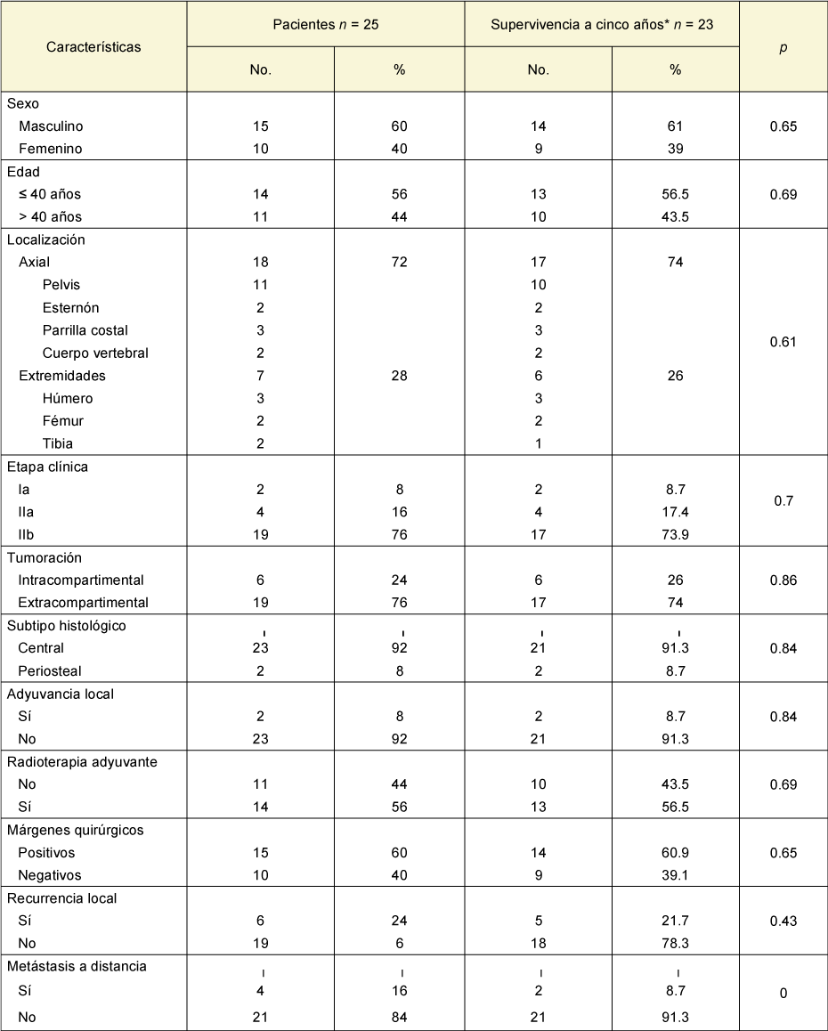 Métodos: estudio descriptivo en el que se incluyeron 25 pacientes con diagnóstico de condrosarcoma óseo que recibieron tratamiento quirúrgico. Se estudiaron variables sociodemográficas, así como localización, grado histológico, estadio clínico, cirugía realizada, complicaciones y mortalidad.