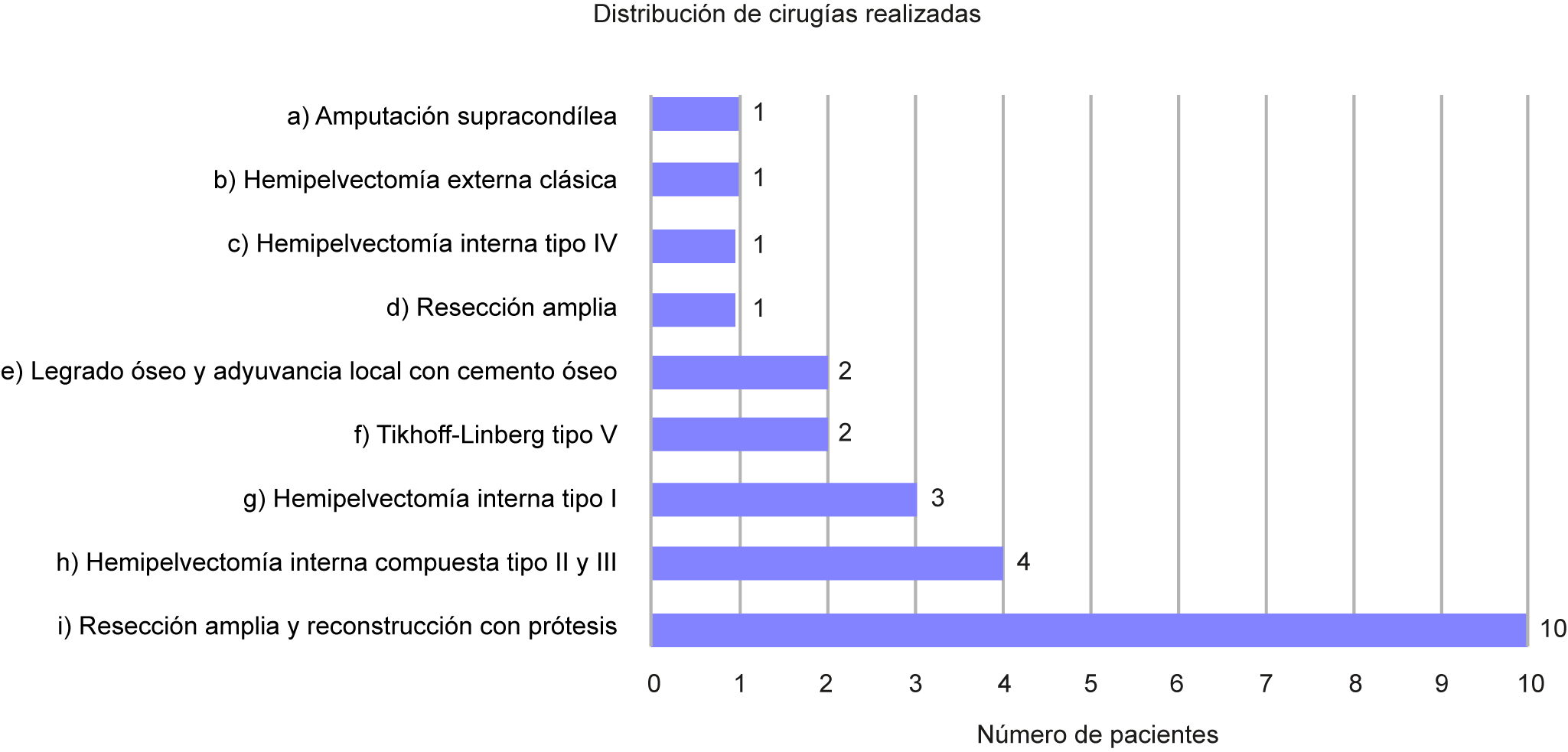 En cuanto al tipo de cirugía realizada, la más frecuente fue la resección amplia y la reconstrucción inmediata con prótesis, en 10 pacientes (40%). La distribución de las cirugías realizadas se presenta en la figura 1.