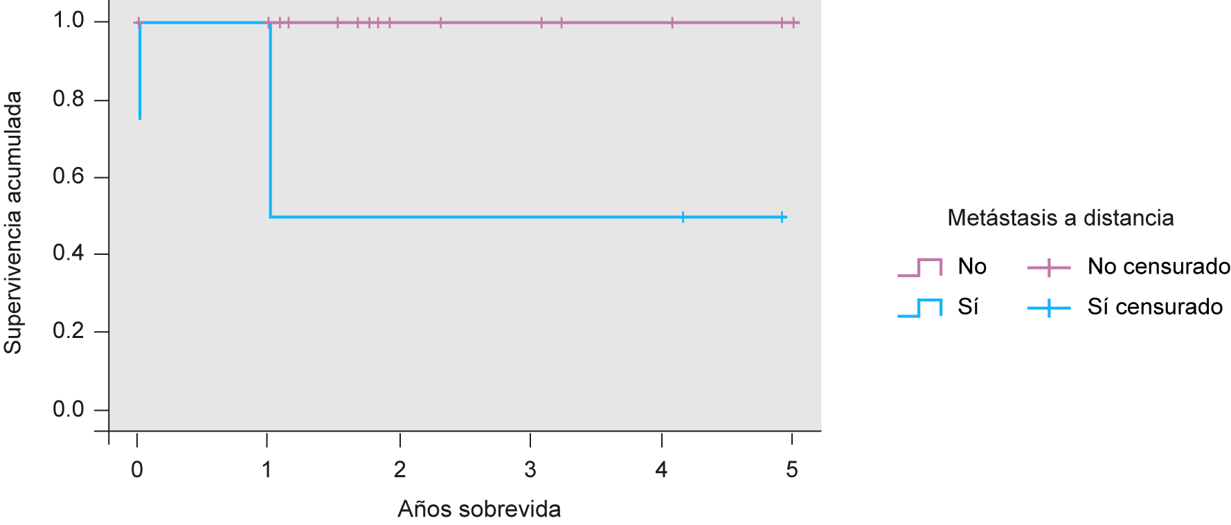 La presencia de metástasis a distancia durante el seguimiento a cinco años afectó significativamente la supervivencia acumulada, dado que registró 2 muertes posteriores a la cirugía (8%), a los seis y 20 meses, respectivamente. Ambos pacientes se encontraban en etapa clínica IIb y en grado histológico 3, con metástasis a pulmón (figura 2).