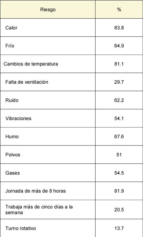 Para el análisis de las condiciones de trabajo, este estudio se inscribe en el campo de la salud laboral, en el que se consideran las categorías analíticas de riesgos y exigencias como elementos determinantes del proceso de trabajo. En esta relación se da la reproducción de elementos nocivos o deteriorantes y protectores para la salud en los centros laborales.13 Los riesgos laborales15,16 se pueden caracterizar en dos formas diferentes: en la primera se incluyen aquellos elementos físicos (ruido, vibraciones), los químicos (polvo, gases, vapores) y los mecánicos (motores, herramientas, sistemas eléctricos en mal estado, instalaciones), los cuales están presentes en el ambiente laboral y son conocidos tradicionalmente como los factores o agentes.17