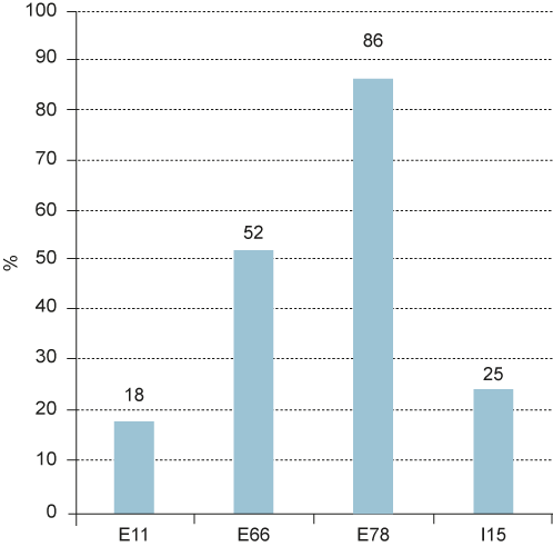 Los datos de signos vitales, somatometría y muestras sanguíneas mostraron que la entidad nosológica con mayor presencia en la población fueron las dislipidemias (86%), principalmente aquellas debidas a hipertrigliceridemia (72%). En segundo lugar se encontró la obesidad (52%) y el sobrepeso (29.5%). La prevalencia de presión arterial fronteriza, HTA y DM2 fue de 4.5%, 25% y 18.1%, respectivamente (figura 1). De los que presentaron hipertensión al momento del estudio, cinco (71%) fueron de HTA1, solo hubo un caso con HTA2 y uno con HTA3.