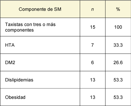 Resultados: el 93% de los participantes presentó algún componente del SM; 34% cumplió con tres o más criterios. Las entidades nosológicas con mayor prevalencia fueron las dislipidemias (86%), la obesidad (52%), la diabetes mellitus tipo 2 (18%) y la hipertensión arterial (25%).