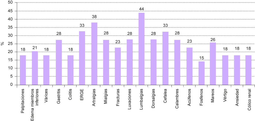 Entre los síntomas más frecuentes, los del sistema musculoesquelético ocuparon el mayor porcentaje, que en conjunto representó el 37.5% de todos los síntomas referidos por la población, particularmente aquellos relacionados con padecimientos de la columna, la cintura escapular y los codos, seguidos de los síntomas digestivos (32% del total de todos los síntomas); dentro de este rubro destacaron la gastritis y la enfermedad del reflujo gastroesofágico (ERGE), los cuales representan respectivamente 33% y 28% en la población estudiada (figura 2).