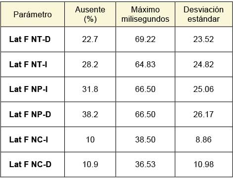 La ausencia de onda F del nervio peroneo, observada con gran frecuencia, contrasta con lo mostrado en diversos estudios, en los que se señala que la onda F es un indicador sensible en el diagnóstico de polineuropatía diabética y, por lo tanto, debe ser considerado como parte del estudio de rutina.24 No obstante, se debe tomar en cuenta que depende de factores como la temperatura de la piel, la aplicación adecuada del estímulo y las dificultades técnicas que puedan existir al estimular los nervios,25 probablemente alguno de estos factores pudo haber alterado la evocación de la respuesta.