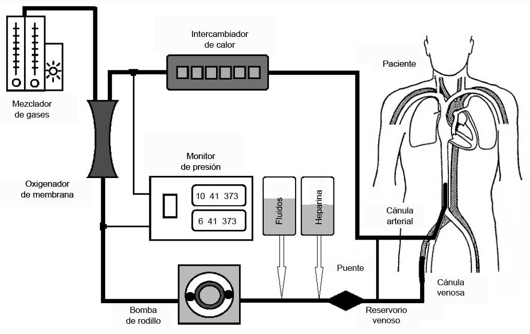 La oxigenación por membrana extracorpórea (ECMO) es una técnica de uso reciente en México, está indicada en casos en los que existe insuficiencia respiratoria grave o en aquellas situaciones en las que el fallo de bomba o la presencia de insuficiencia cardiaca es refractaria a otras líneas de tratamiento.