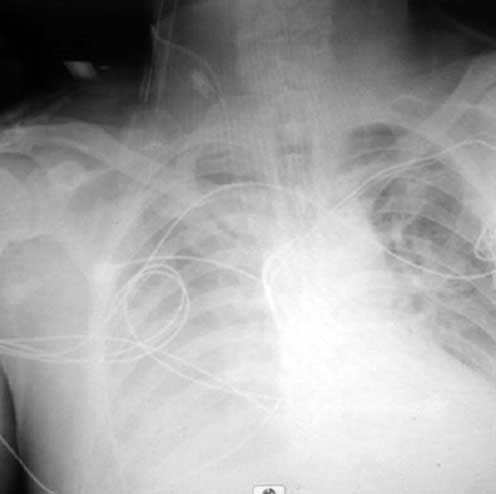 Paciente del sexo masculino, de 62 años de edad, médico de profesión, originario de Cochabamba, Bolivia, residente de un estado de México, con antecedente de tabaquismo intenso de 12 años de evolución e intolerancia al metoprolol. Inició su padecimiento en el año 2003 con la sucesión de contracciones prematuras aisladas, se le diagnosticó miocardiopatía chagásica crónica dilatada, por lo cual recibió tratamiento parasiticida, continuando con disfunción progresiva del sistema de conducción, llegando a la taquicardia ventricular. Tras un año del diagnóstico se le implantó un desfibrilador automático interno (DAI), persistiendo con desgaste paulatino de la clase funcional. Como mejor opción terapéutica en el 2005, se le inyectaron células madre por vía percutánea intracoronaria (descendente anterior, circunfleja y coronaria derecha), permaneciendo asintomático desde entonces con una buena capacidad funcional. Fue hasta julio de 2014 que presentó astenia, disnea, oliguria y tumefacción en miembros inferiores, por lo que acudió a centro hospitalario, donde se le suministró tratamiento, 5 días después de hospitalización fue dado de alta. Por falta de mejoría acudió con facultativo, quien lo refirió a un hospital de cardiología de tercer nivel de atención el 15 de agosto. A su llegada al servicio de urgencias del hospital refirió acentuación de sintomatología previa, presentaba episodios de palpitaciones, hipotensión, taquicardia, taquipnea, aleteo nasal, retracciones supraesternales y subcostales; a la auscultación se encontraron campos pulmonares con hipoventilación basal bilateral, ruidos cardiacos rítmicos, con ápex desplazado y tercer ruido constante, soplo holosistólico en foco mitral II/IV, edema difuso de la cara cerca del área palpebral, tronco y extremidades con fóvea hasta las rodillas. En la analítica se encontró leucocitosis y elevación del péptido natiuretico cerebral. La gasometría indicó hipoxemia y acidosis mixta. En el electrocardiograma se apreció taquicardia supraventricular. En la radiografía de tórax se observó un desfibrilador subclavio izquierdo, cardiomegalia con dilatación de las cuatro cámaras, así como signos de congestión venosa pulmonar, redistribución superior de la vasculatura pulmonar, aumento del tamaño del mediastino y los hilios, con disminución generalizada de la vascularización (figura 2).