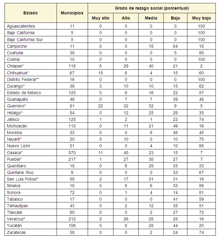 Al clasificar los estados de acuerdo con la proporción de los municipios que tienen muy alto GRS se observó que Guerrero, Chihuahua, Oaxaca y Chiapas tienen entre un 22 y 8% de sus municipios en este GRS, mientras que entre los estados en los que 100% de sus municipios se ubicaron en muy bajo GRS se registraron Aguascalientes, Baja California, Baja California Sur, Colima y Distrito Federal (hoy Ciudad de México) (cuadro I).