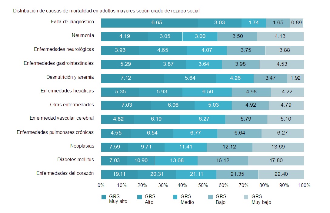 Resultados: las principales causas de muerte en el GRS muy alto fueron enfermedades del corazón, neoplasias, desnutrición y anemia, diabetes mellitus (DM) y “falta de un diagnóstico preciso relacionado con el tipo de atención recibida”; en los otros GRS las causas fueron enfermedades del corazón, DM, neoplasias, enfermedad pulmonar obstructiva crónica y enfermedad vascular cerebral o enfermedades hepáticas.