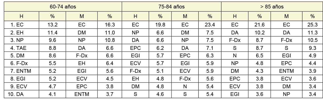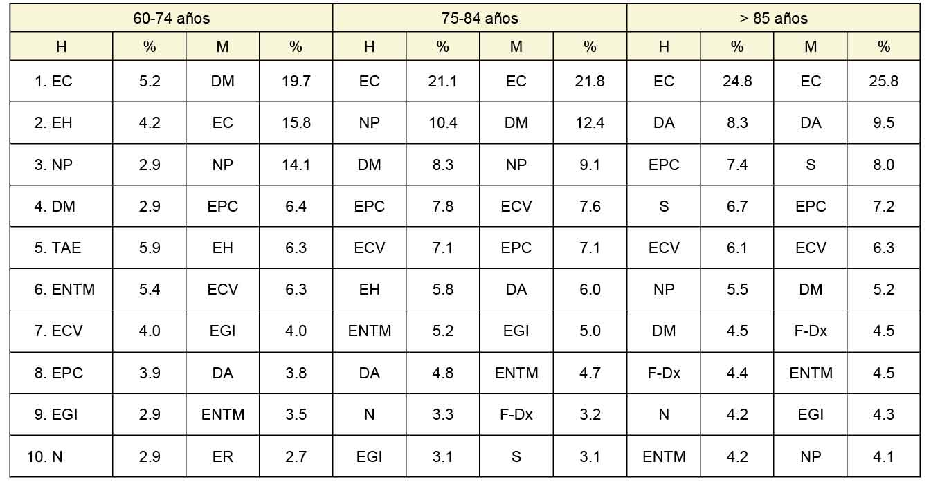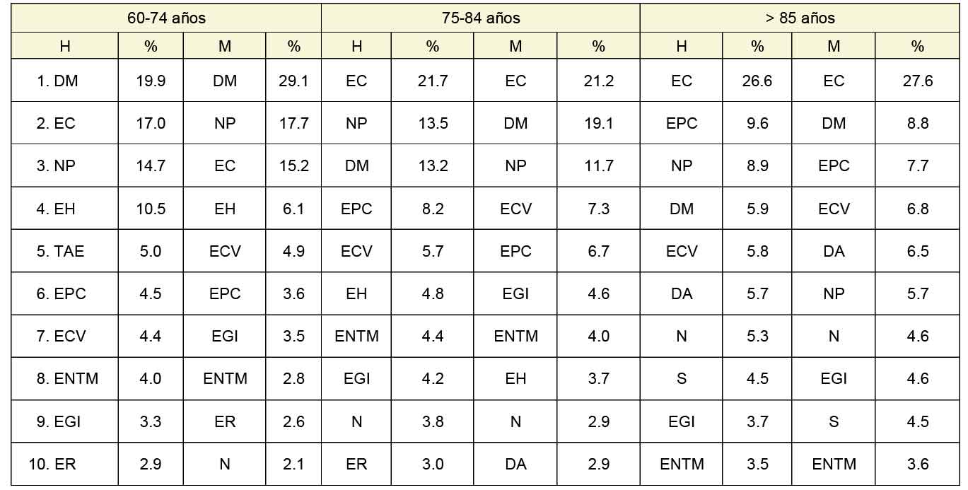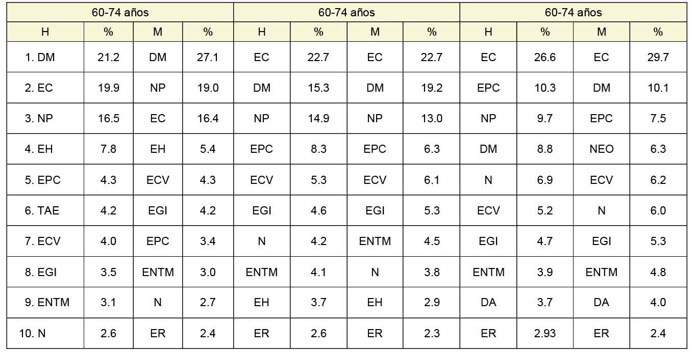 El análisis por grupos de edad mostró que en los grupos de 60 a 74 años y de 75 a 84 años, la DM, por un lado, y las enfermedades del corazón y las neoplasias, por el otro, causaron el 57.8% y 51.9% de las muertes, respectivamente; en el grupo de mayores de 85 años las enfermedades del corazón, la DM y las enfermedades pulmonares crónicas ocasionaron 45.2% de las defunciones.